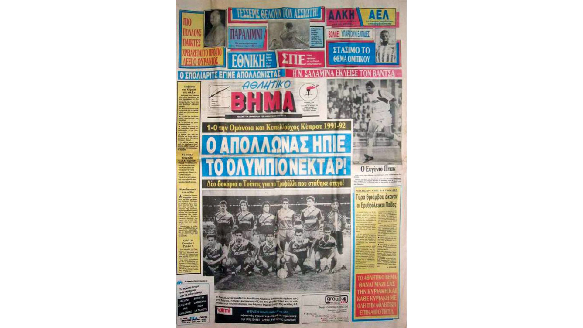 Στο μεγάλο τελικό αντίπαλος η Ομόνοια στις 10 Ιουνίου 1992 στο Τσίρειο στάδιο μετά από κλήρωση ανάμεσα σε αυτό και το Μακάρειο στάδιο. Στο 53΄, ο Απόλλωνας κέρδισε πέναλτι με τον Πάμπο Πίττα που ανατράπηκε στην περιοχή από τον Παναγιώτου. Εκτελεστής ο Πτάκ και το 1-0 ήταν γεγονός εν μέσω έντονων πανηγυρισμών από τις 7 χιλιάδες των οπαδών μας στη δυτική κερκίδα. Παρά την πίεση που εξάσκησε η Ομόνοια μετά το 53΄ δεν μπόρεσε να σκοράρει (είχε δοκάρι και στις καθυστερήσεις) και το κύπελλο πήγε στην τροπαιοθήκη του Απόλλωνα.