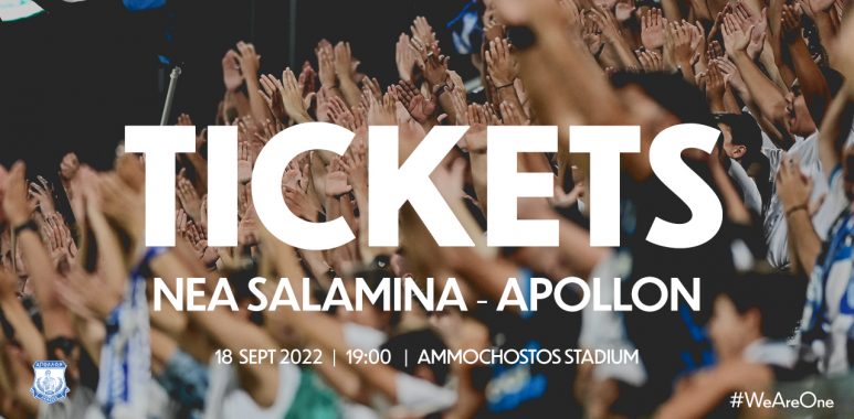 Η Εταιρεία Απόλλων Ποδόσφαιρο (Δημόσια) Λτδ, ανακοινώνει την έναρξη της προπώλησης των εισιτηρίων του αγώνα της 4ης αγωνιστικής του πρωταθλήματος Cyta με αντίπαλο τη Νέα Σαλαμίνα ο οποίος θα διεξαχθεί την Κυριακή (18/09, 19:00) στο γήπεδο «N. PAPAS GROUP – ΑΜΜΟΧΩΣΤΟΣ- ΕΠΙΣΤΡΟΦΗ».