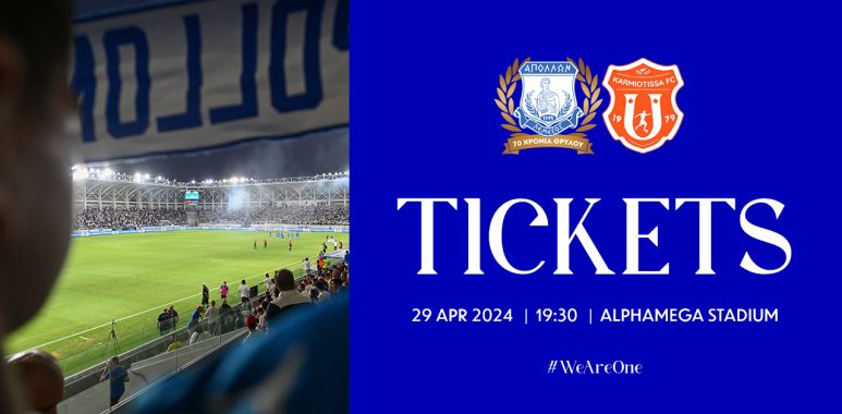Η Εταιρεία Απόλλων Ποδόσφαιρο (Δημόσια) Λτδ ανακοινώνει ότι αρχίζει η προπώληση εισιτηρίων για τον αγώνα της 12ης αγωνιστικής της Β’ φάσης του πρωταθλήματος Cyta με αντίπαλο την Καρμιώτισσα ο οποίος θα διεξαχθεί τη Δευτέρα (29/04, 19:30) στο Στάδιο “Αλφαμέγα”.