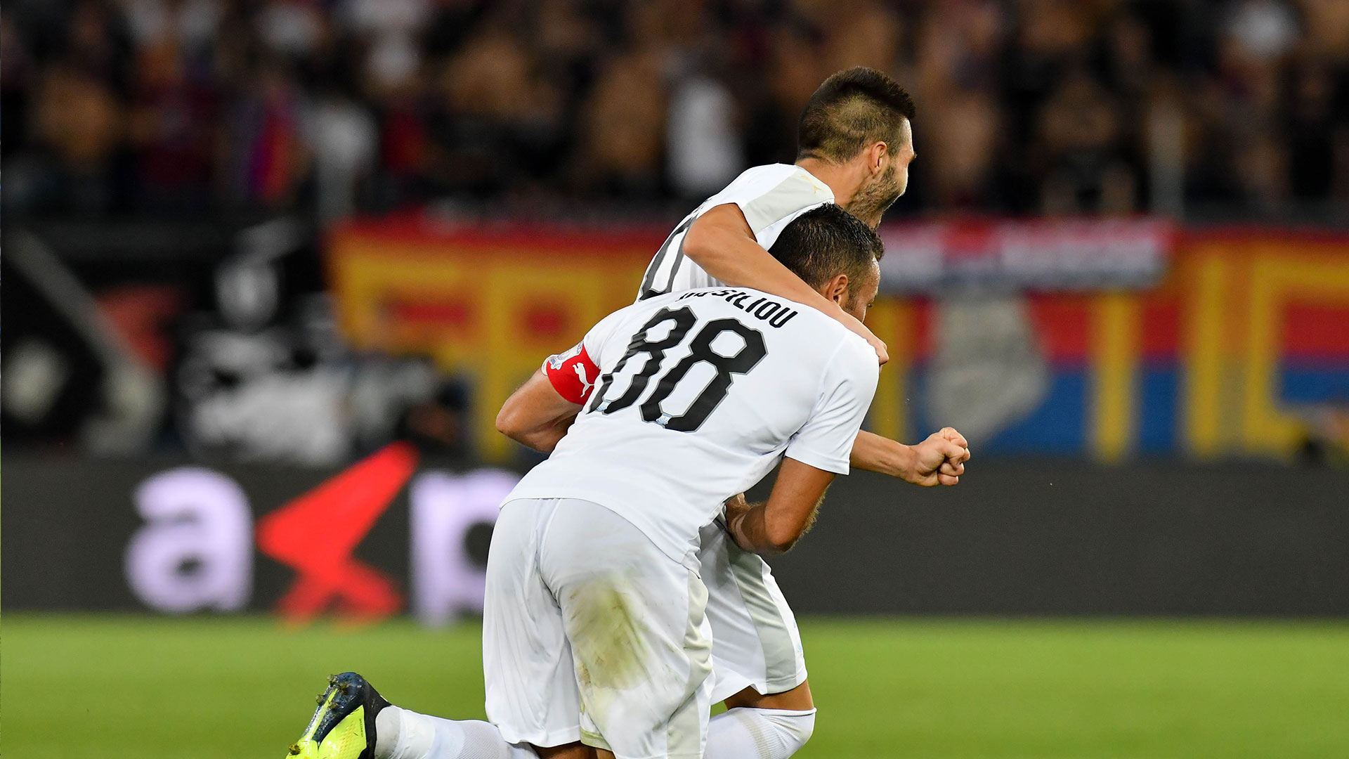 Ο πρώτος αγώνας ολοκληρώθηκε με νίκη της Βασιλείας με 3-2 στο επιβλητικό St. Jakob-Park της Ελβετίας. Η ομάδα μας παρά το γεγονός ότι δέχθηκε νωρίς τέρμα, κατάφερε να ανατρέψει το σκορ σε 1-2 με τους Παπουλή και Μάγκλιτσα, χωρίς ωστόσο στο τέλος να καταφέρει να πάρει κάτι περισσότερο από τη «στενή» ήττα. Οι Ελβετοί σκόραραν ακόμη δύο φορές από ισάριθμα κόρνερ και διαμόρφωσαν το τελικό σκορ (3-2) το οποίο όμως έδινε ελπίδες πρόκρισης στην ομάδα μας.
