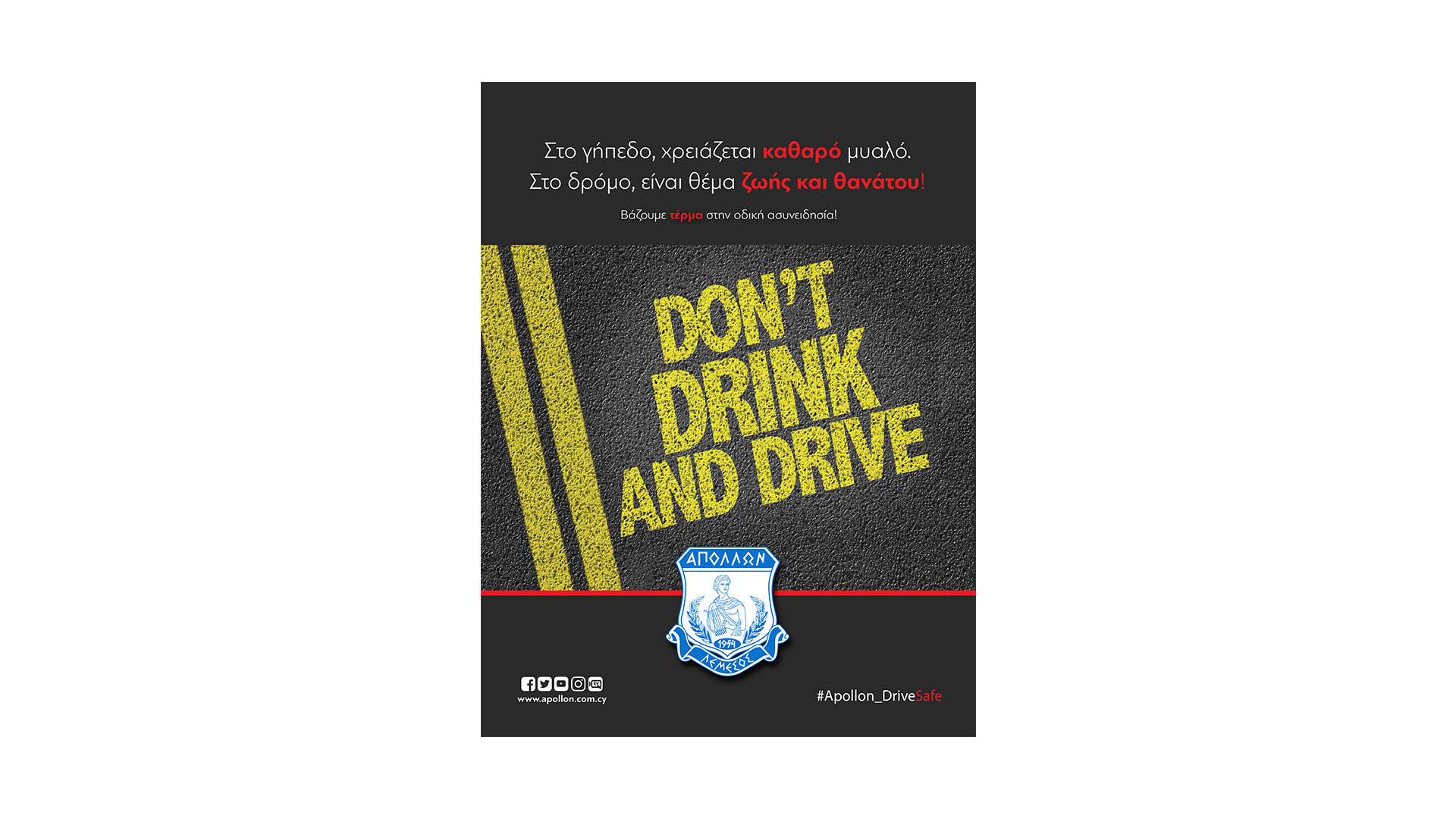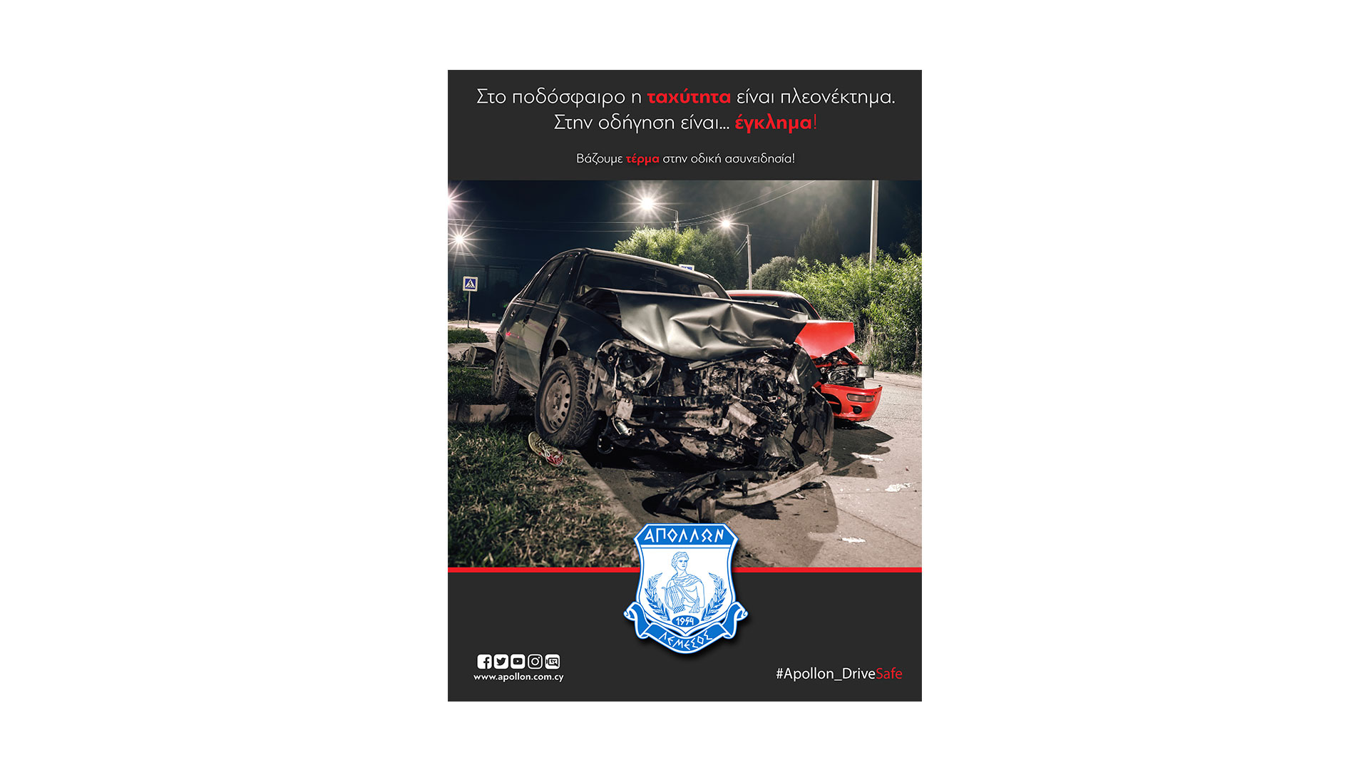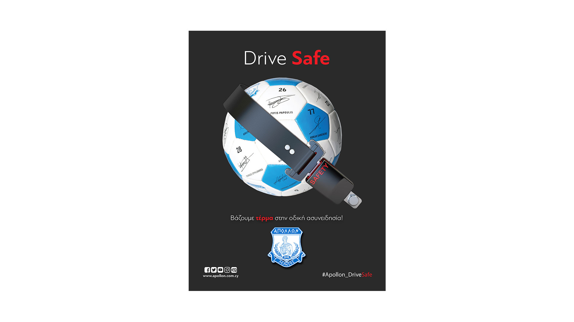 The main message of the campaign is “We put an end to driving unconsciousness” and the hashtag #apollon_drivesafe. Posts on our official website and on all Apollon’s social media, use of the creatives for Match Day, Starting XI, Half / Full Time, entries in all the Match Programs that were released in all the European matches of the team, messages on the giant screens and on the stadium signs, are some of the actions that have already been done and continue to this day.